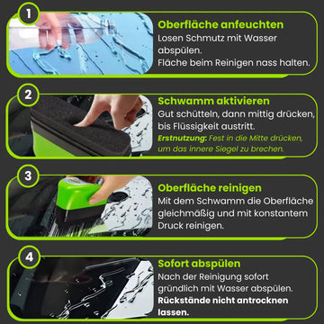 Beim ersten Mal: Einmal fest in die Mitte drücken, um das innere Siegel zu knacken. - Reinigen: Arbeite den Schaum mit dem Schwamm gleichmäßig und mit etwas Druck in die Scheibe ein.
